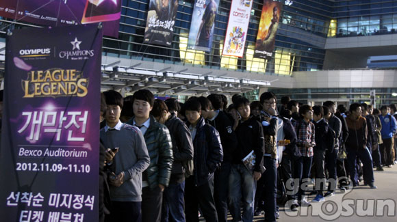... '지스타 2012' 개막을 하루 앞둔 8일, 부산 벡스코에서 '2012 게임대상' 시상식이한창인 가운데, 부산의 많은 게임 팬들이 9일 개막하는 '올림푸스 리그오브레전드 더 챔피언스 윈터 2012' 입장권을 받기 위해 벡스코 광장을 가득 메우고 있다. [지스타12 특별 취
