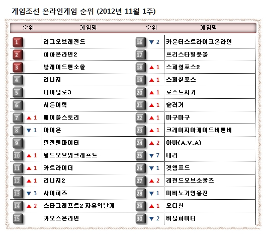 ... 웹보드 게임과 웹브라우징 게임은 제외된 리스트입니다. 11월 1번째 주(10월 29일 ~ 11월 4일) 온라인게임 순위입니다. 이번 주에는 1위부터 6위까지 순위 변동이 없었습니다