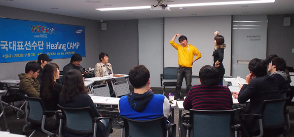 ... 이번 힐링캠프는 그랜드 파이널에 관한 간단한 오리엔테이션으로 시작해 WCG2007 우승 및 WCG2008~2009 준우승을 차지했던 송병구와의 대화 시간으로 이어졌다. 송병구가 자신의 경험담과 팁을 전하며 올해 선발된 한국대표선수단을 응원했다. 이외에도 한국대표선수단을 위한