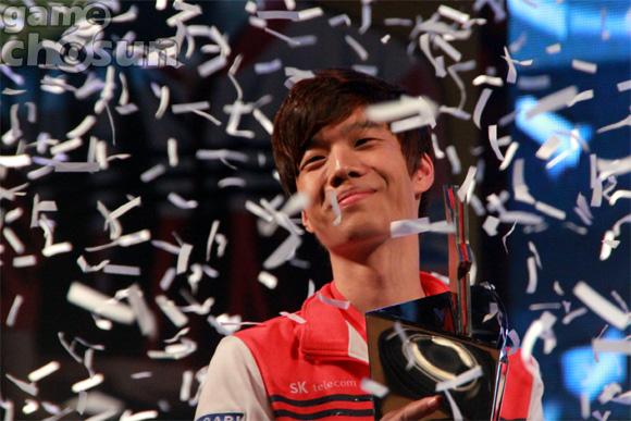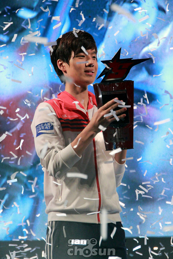 ... SK텔레콤T1 정윤종이 27일 서울 한양대하교 올림픽체육관에서 진행된 '옥션 올킬 스타리그 2012' 결승전에서 MVP 박수호를 4대1로 완파하며 우승을 차지했다. [이시우 기자 siwoo@chosun. com] [gamechosun