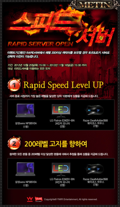 ... 회사 측은 래피드 서버에서 200레벨 이상으로 성장한 캐릭터에 한해 정식서버인 ‘토르’와 ‘로키’로 캐릭터 이전을 허용한다. 이미르엔터테인먼트는 ‘메틴’의 첫 스피드 서버 운영을 기념하기 위해 이벤트를 진행한다. ‘래피드’서버 1차 운영기간 중 최상위 레벨 10위 안에