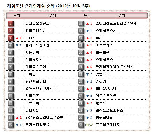 ... 웹보드 게임과 웹브라우징 게임은 제외된 리스트입니다. 10월 3번째 주(10월 15일 ~ 10월 21일) 온라인게임 순위입니다. 이번 주 상위권에는 3, 4위의 순위가 바뀌었을 뿐 큰 변화가 없었습니다