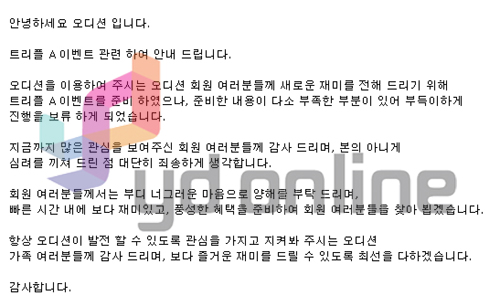 ... 오디션’과 ‘드래곤플라이트’의 온‧오프라인 대회로 화제를 모았던 와이디온라인의 트리플A이벤트가 잠정 중단됐다. 와이디온라인은 지난 19일 자사의 게임포탈 엔돌핀을 통해 이벤트를 보류하게 됐다고 공지했다. 앞서 와이디온라인은 다음 달 부산 벡스코에서 열리는 대한민국 최