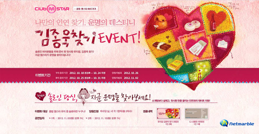 ... 이벤트 참가를 희망하는 이용자는 '클럽 엠스타'홈페이지 내 이벤트 페이지를 통해 응모할 수 있으며, 넷마블은 추첨을 통해 '김종욱 찾기' 뮤지컬 관람권(1인 2매)과 CJ 상품권을 경품으로 증정한다. 당첨자는 1명의 동성친구와 동행해 음료지원 등의 혜택과 함께 다른 이성