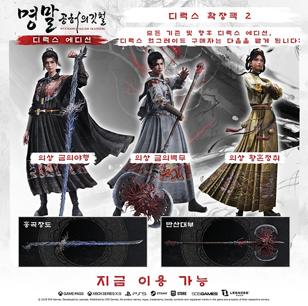 ... 이번 확장팩에는 추가 의상 3종과 추가 무기 2종이 포함된다. 추가적으로, 모든 명말: 공허의 깃털 보유자에게4종의 무료 머리 장신구도 제공된다. 지금까지 두 번의 업데이트를 통틀어 총 6종의 머리 장신구를 완전히 무료로 획득하게 되는 것이다