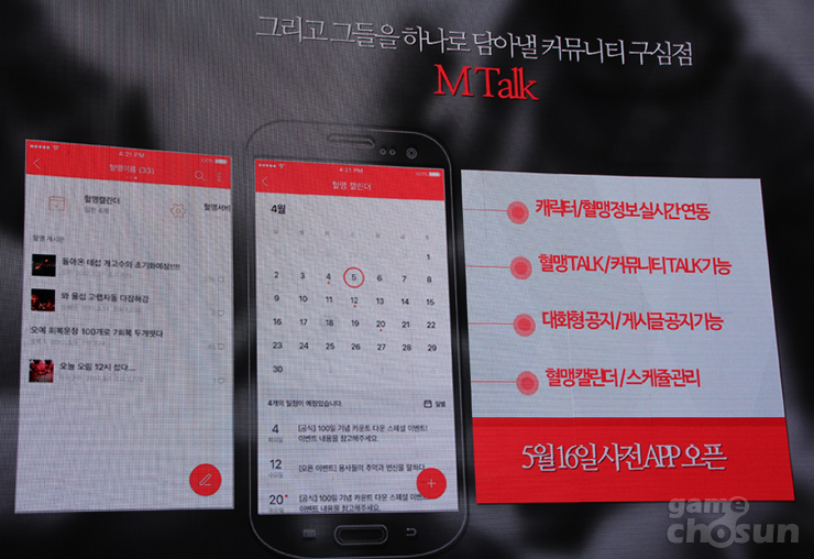 ... 심승보 엔씨소프트 전무는 "엠톡은 리니지M을 플레이할 때 커뮤니케이션, 즉, 혈맹 단위의 단체 커뮤니케이션을 활발하게 하는 독립적인 앱"이라고 말했다. 한편 리니지M은 오는 6월 21일 정식 출시를 앞두고 있다. [최희욱 기자 chu1829@chosun