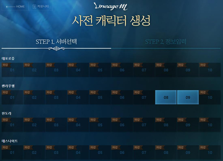 ... 18일 오전 10시 20분 현재 총 100개 서버 중 49개가 사전 캐릭터 생성이 마감된 상태다. 특히 유저들 사이에서 '1 서버'라 불리는 '데포로쥬'와 '데스나이트' 서버가 가장 먼저 사전 캐릭터 생성이 마감됐다. 리니지M은 사전예약을 시작한 지 32일 만에