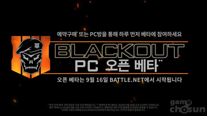 ...오는 9월 16일 오전 2시부터 9월 18일 오전 2시까지(한국 시간 기준) 만 이틀 동안 '블랙옵스' 세계관에 대규모 배틀 로얄로 풀어낸 블랙아웃 모드를 만나볼 수 있다. 이번 오픈 베타 테스트는 장소에 구애받지 않고 참여 가능하다. 한국 PC방에서는 사방에 출몰하는 적들과 마