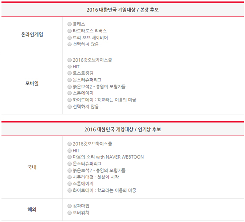 ... 더불어 인기상 후보로 국내 부문에서는 '2016갓오브하이스쿨' '히트' '마음의소리 with 네이버웹툰' '몬스터슈퍼리그' '붉은보석2-홍염의모험가들' '사쿠라대전: 전설의시작' '스톤에이지' '화이트데이: 학교라는이름의미궁'이, 해외 부문은 '검과마법' '오버워치'가 선정