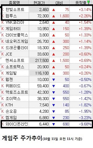 ... 오전 11시 현재 컴투스와 한빛소프트만이 전일보다 각각 +2. 69%와 +2. 10%로 게임주 가운데 가장 높은 오름세를 나타내고 있다