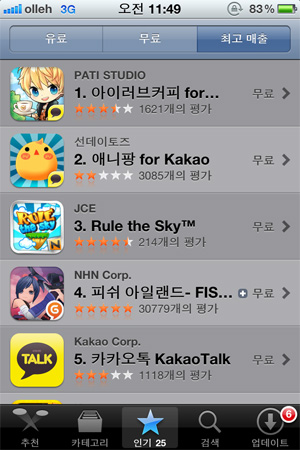 ... '아이러브커피'와 '애니팡'은 모두 모바일 메신저 '카카오톡'과 연동되는 인기 게임으로 지난달 11일 애플 앱스토어에 동시 출시된 이래 줄곧 1, 2위를 다퉈왔다. '아이러브커피'가 일일사용자(DAU) 1000만 명의 '애니팡'을 출시 23일만에 압도한 원인으로는게임 자