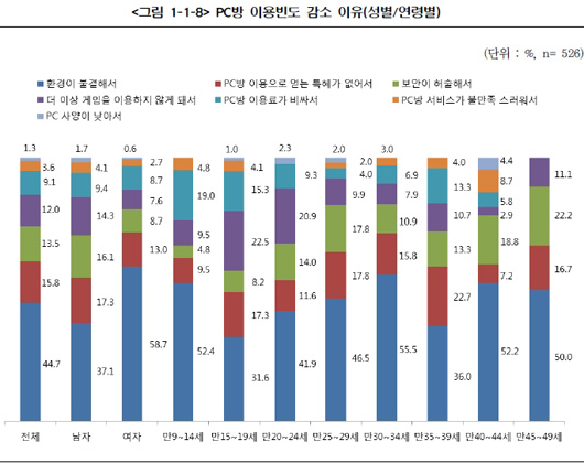 ...5%가 이용빈도 '감소'에 도장을 찍고, 주된 이유로 'PC방의 불결함'을 꼽은 것으로 나타났다. 이번 조사는 대한민국 만9~49세 국민 중 최근 6개월 내 게임관련 상품구입 및 이용겸험자를 대상으로 시행됐으며 표본수는 1700명이다. 조사 대상자의 62