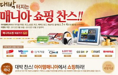 ... 아이템매니아는 ‘매니아 쇼핑’ 오픈을 기념해 ‘대박찬스 이벤트’를 실시한다. 공식 홈페이지를 통해 쇼핑몰을 이용한 뒤 해당 쇼핑몰(명)과 주문번호를 입력하면 추첨을 통해 갤럭시 노트 10. 1, LG시네마 3D 모니터, 스키장 시즌권, 제주도 왕복 항공권 등 선물을 제공한다