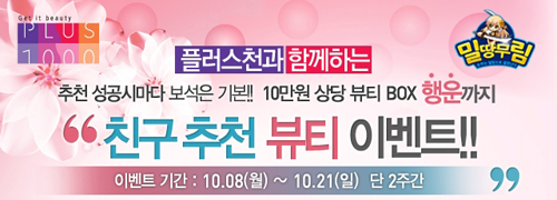 ... 먼저 모바일메신저 '카카오톡'을 통해 '밀땅무림'에 초대 받은 친구가 추천인란에 유저 닉네임을 입력하면 각각 3개의 캐시를 지급한다. 친구 추천은 최대 5명까지 가능하다. 또 기간 중 3명 이상의 친구 추천에 성공하면 플러스천이 제공하는 10만 원 상당의 화장품 랜덤박스