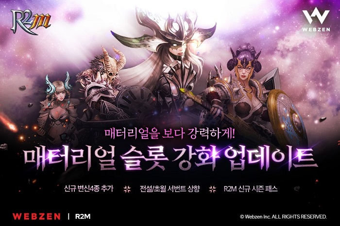... 먼저, ‘R2M’의 슬롯 강화 시스템에 ‘매터리얼’ 슬롯이 추가되었다. 캐릭터가 장착한 ‘매터리얼’의 등급에 따라 슬롯을 강화할 수 있으며, 새롭게 추가된 2종의 매터리얼 슬롯 강화 주문서로 슬롯의 등급을 높