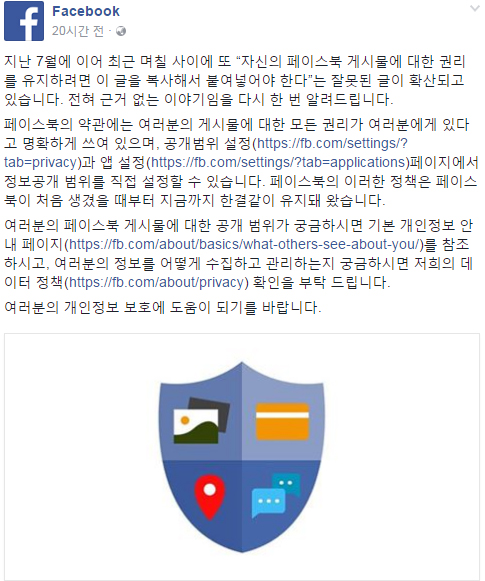 ...더불어 "나는 페이스북 또는 페이스북에 연계된 어떤 곳에서도 과거와 미래 모두를 포함하여 내 사진, 정보, 메시지 또는 게시물등을 사용하는 것을 금지 합니다"라는 내용도 담겨있다. 이에 대해 페이스북은 "지난 7월에 이어 최근 며칠 사이 잘못된 글이 확산되고 있다. 전혀 근거 없