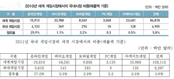... ◆ 온라인·모바일게임 비중 소폭 상승 백서에 따르면, 지난해 매출액 기준 국내 게임시장(63억9700만 달러)는 세계 게임시장(1081억1300만 달러)에서 5. 9%의 점유율을 기록했다. 이는 전년대비 0
