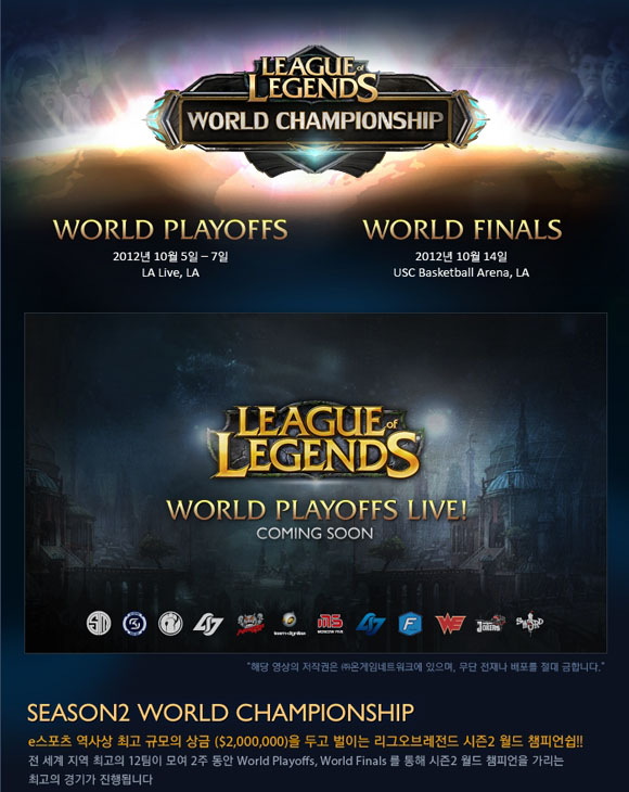 ... 특히 라이엇 게임즈는 온게임넷과 함께 한국 중계진의 LA 현지방문 및 한국어 중계를 준비, 한국 플레이어들이 보다 편하게 세계 대회를 함께 할 수 있도록 했다. 온게임넷 또한 동일한 방송 내용을 5일의 플레이오프 그룹 스테이지 전 경기에 대한 스트리밍 생중계를 비롯해,