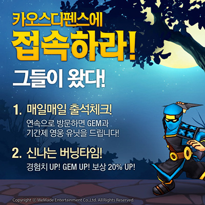 ... 위메이드엔터테인먼트(대표 김남철, 남궁훈)는 모바일게임 '카오스앤디펜스'에서 한가위 맞이 대규모 버닝 타임 이벤트를 실시한다고 28일 밝혔다. 이번 이벤트는 9월 29일부터 10월 1일까지 3일간 진행되며 경험치와 캐시아이템인 '젬' 20% 추가 보상 등 혜택을 담고 있다.