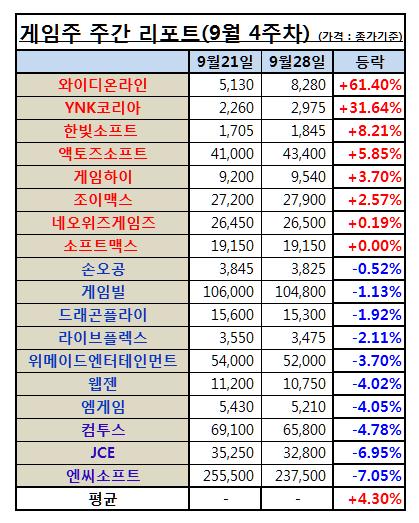 ...30%. ◆ '팡' 효과 여전 … 와이디온라인 +61% 급등 와이디온라인은 이번주에 +61. 40%의 등락률을 보이며 게임주 등락 1위를 기록했다