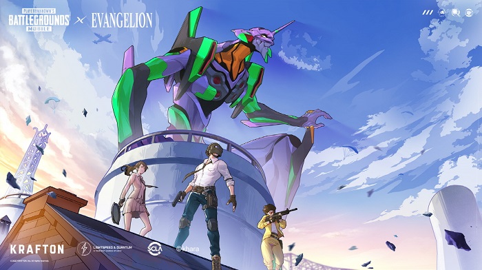 ... ‘에반게리온’ 테마 모드의 자기장 안전구역은 3. 5x3. 5km 범위로 랜덤하게 생성되며, 맵 곳곳에 배치된 에반게리온 상자와 방위 포대에서는 다양한 전투 장비를 획득할 수 있다