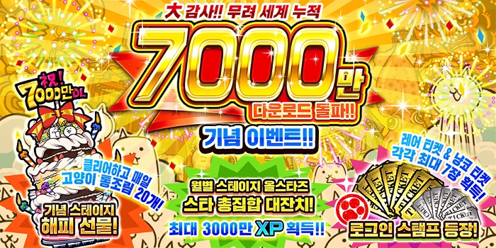 ... [자료제공 = 포노스] 주식회사 포노스(대표: 츠지코 요리카츠)는 병맛&귀염 타워디펜스 게임을 대표하는 <냥코대전쟁>에서 2022년 5월 16일 11시부터 전세계 누적 7000만 다운로드를 기념하는 이벤트가 개최된다고 밝혔다. ■기간 한정 레어 뽑기