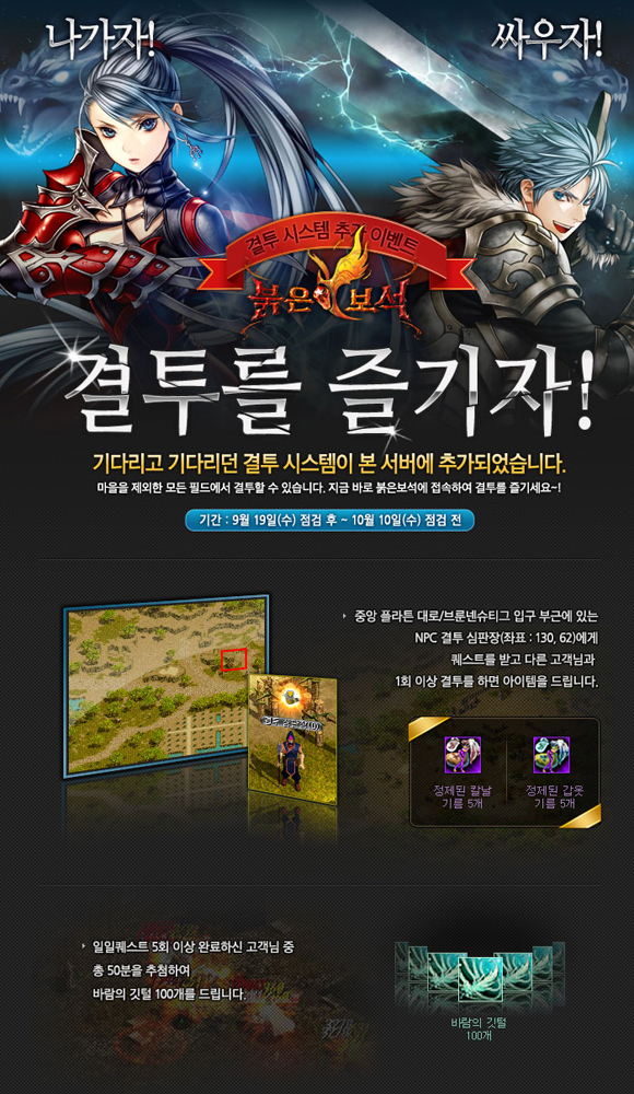 ... 결투를 하고 싶은 유저에게 신청을 한뒤 상대방이 수락하면 결투가 성립되며, 길드전과 동일한 전투 시스템으로 진행된다. 결투 시스템 추가를 기념해 ‘결투 장려 프로젝트!’ 이벤트가 진행된다. 유저는 NPC 결투 심판장에게 퀘스트를 받고 다른 유저와 1회 이상 결투를 하면 승