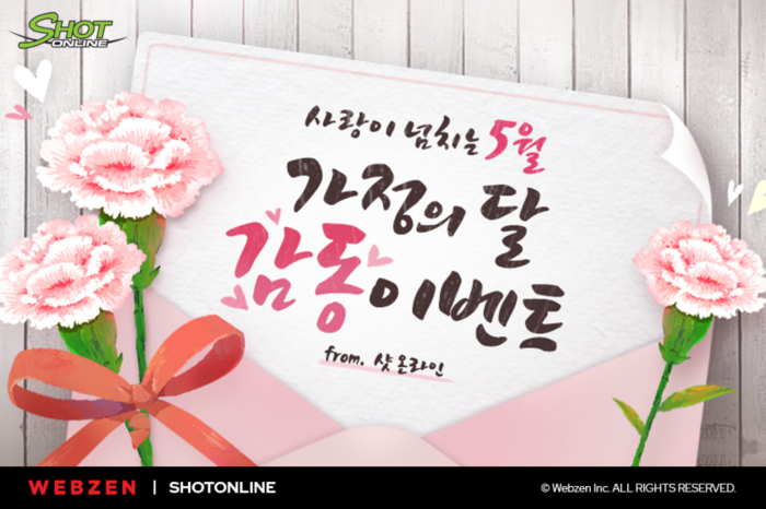 ... 웹젠의 '샷온라인' 5월 가정의 달 이벤트는 총 4가지 이벤트로 구성되어 있다. '샷온라인' 회원들은 '지정일 출석 이벤트'에 참여하면 '암브로시아 55%', '스마트 볼마커 A', '골드 플레