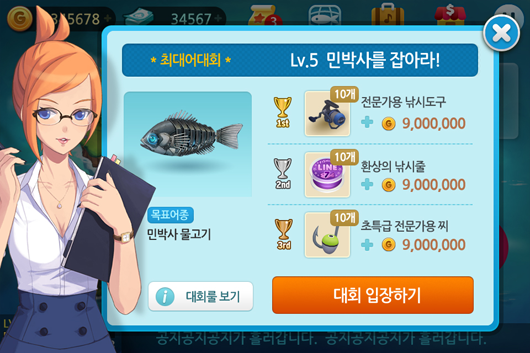 ... 한게임은 대회 우승자에게 평소 얻기 힘든 게임내 아이템과 상금을 지급하고, 어장쟁탈 우승자에게는 명예의 전당 및 어장주인으로 등록되는 특전을 제공한다. NHN 한게임 스마트폰게임1사업부 최현동 부장은 “피쉬아일랜드는 출시 일주일도 안돼 기존 낚시게임들의 순위 및 최고 일