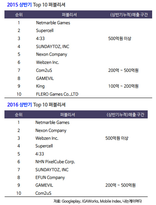 ... 이 같은 성과는 '세븐나이츠' '모두의마블' 등 롱런 타이틀이 견고한 매출원으로 자리 잡았기 때문이다. 전년도 동기간 5위, 6위였던 넥슨과 웹젠은 슈퍼셀과 네시삼십삼분을 밀어내고 2위, 3위를 기록했다. 넥슨의 경우 '히트'가 상반기 누적 매출 500억원 이상 기록해 순위 상