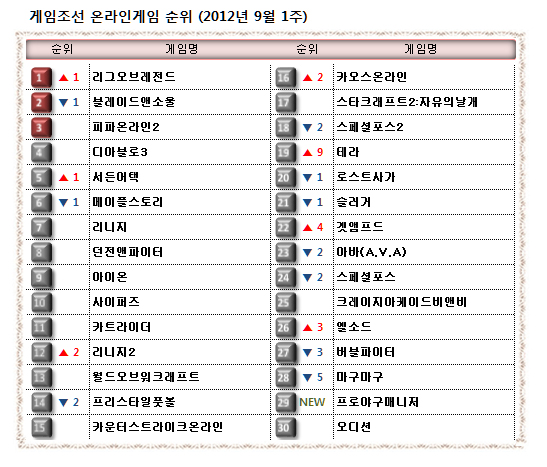 ... 웹보드 게임과 웹브라우징 게임은 제외된 리스트입니다. 9월 1번째 주(9월 3일~ 9월 9일) 온라인게임 순위입니다. 이번 주는 ‘리그오브레전드’(이하 LOL)가 다시 1위를 차지했습니다