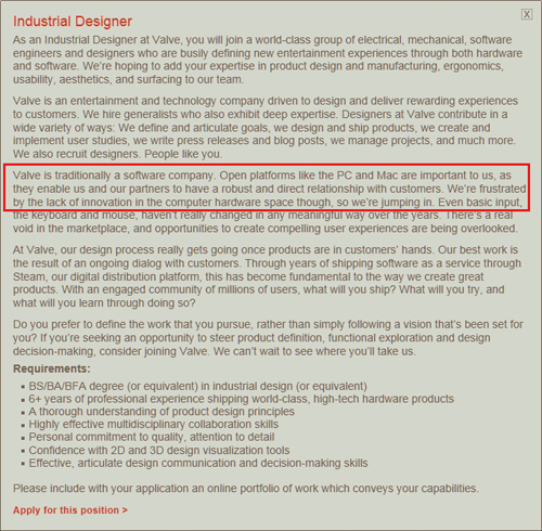 ... 밸브는 인력 채용 공고에서이번 하드웨어 진출이 새로운 혁신을 위한 조치라고 밝혔다. “우리는 컴퓨터 하드웨어 시장에서 혁신의 결핍으로 인해 좌절을 맛 보았기에 참여하겠다”고 적혀있다. 한편 밸브는올초게임기기를 제작한다는소문이 퍼진 바 있다