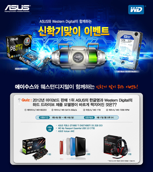 ... ‘ASUS 지포스 GTX660 TI DCU II 그래픽카드’, ‘웨스턴디지털 1TB My Passport Essential USB 3. 0 외장하드’, ‘ASUS Vulcan ANC 헤드셋’ 등의 경품이 추첨을 통해 지급될 계획이다. 에이수스코리아 곽문영 마케팅 팀장은 “저장