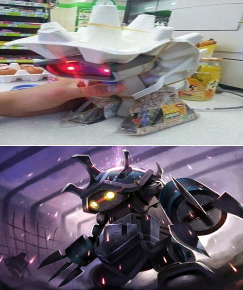 ... 공개된 사진에는 수작업으로 제작된 LOL 챔피언 람머스의 신규 스킨인 '풀 메탈 람머스'가 등장한다. 한 가지 특이한건 제작에 사용된 재료만으로도 제작자의 직업을 유추할 수 있다는 점이다. 다소 엉성한 사진 속 람머스는 가격을 인식하는 바코드 스캐너를 비롯해 계란판,