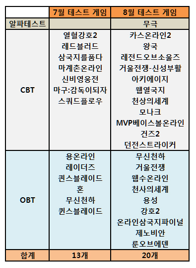 ... 하지만 다음 달인 8월에는 ‘아키에이지’와 ‘던전스크라이커’, ‘MVP베이스볼온라인’을 포함한 7개가 증가한 20개게임의 테스트가 실시됐다. 게임 업계들은 학생들의 방학이 한창인 7월에 신규 게임의 서비스를 시작하면 유저를 쉽게 늘릴 수 있지만 성수기를 포기하고 뒤 늦은 8월