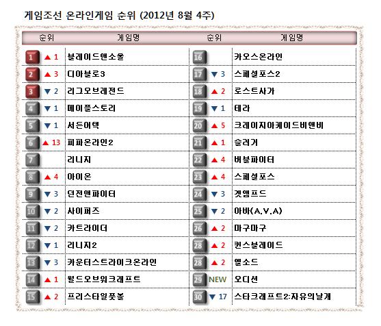 ... 웹보드 게임과 웹브라우징 게임은 제외된 리스트입니다. ▲ 게임조선 8월 4주 온라인게임 순위 8월 4번째 주(8월 20일~8월 26일) 온라인 게임 인기 순위입니다. 이번 주는 1~3위의 게임 순위가 모두 바뀌었습니다