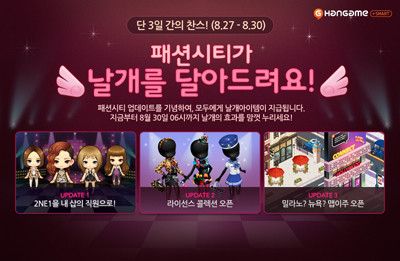 ... '패션시티'는 지역에 따라 샵 주변의 마을 배경과 의상이 달라진다. '라이선스 컬렉션'은 자신이 보유한 콜렉션을 한눈에 볼 수 있게 한 기능으로, 한게임은 유저가 하나의 콜렉션을 완성할 때마다 특별한 레어 아이템을 제공한다. '패션시티'는 원하는 의상을 제작해 매장에 전시