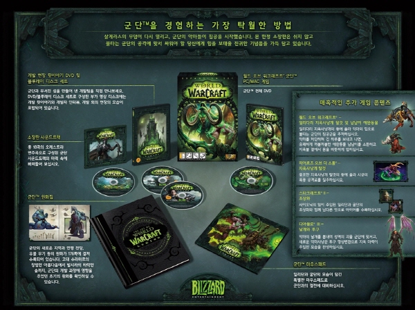 ...군단 소장판 예약 판매는 준비된 물량이 소진될 때까지만 진행되며, 예약 구매한 군단 소장판은 8월 30일부터 택배로 발송이 시작될 예정이다. 군단 소장판에는 월드오브워크래프트 90일 이용권과 함께 게임 내에서 사용 가능한 탈것인 '일리다리 지옥사냥개'와 애완동물 '냠냠이', 히어로
