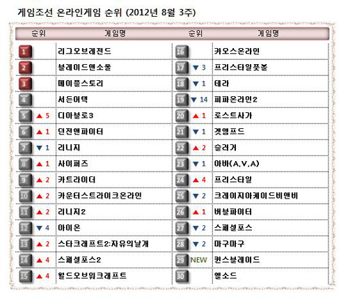 ... 웹보드 게임과 웹브라우징 게임은 제외된 리스트입니다. ▲ 게임조선 8월 3주 온라인게임 순위 8월 3번째 주(8월 13일~8월 19일) 온라인 게임 인기 순위입니다. ‘리그오브레전드’와 ‘블레이드앤소울’의 강세는 이번주에도 변함이 없었습니다