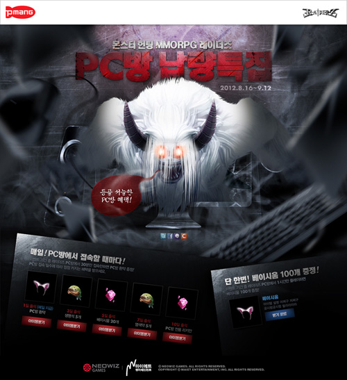 ... 네오위즈게임즈는 내달12일까지 ‘레이더즈’ 전용 PC방에서 30분이상 게임을 플레이하면 모든 이용자에게 강화석, 생명의 부적, PC방 전용 탑승장비 등의 게임 아이템을 증정한다. 또 이벤트 기간 중 PC방에서 1시간 이상 플레이한 이용자에게는 금괴 아이템 10개를 추가로 지