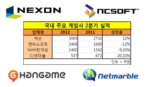 ... 상반기 넥슨으로의 피인수라는 빅이슈를 낳았던 엔씨소프트는 매출 1,468억, 성장률 -12%를 기록했다. NHN한게임은 매출 1,400억, 성장률 -9. 20%를 기록했으며, CJ E&M 넷마블은 매출 537억, 성장률 -20