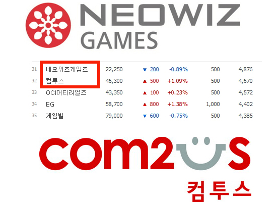 ... 8일 기준으로 네오위즈게임즈와 컴투스의 시가총액은 각각4876억원과4670억원을 기록했다. 불과 200억원의 차이를 나타내고 있지만코스닥 시가총액 순위에서는 컴투스는 32위, 네오위즈게임즈는31위를 차지했다. 매출을 놓고 봤을 때는네오위즈게임즈의 기업가치는바닥임을 드러
