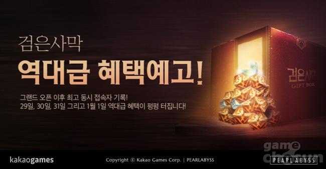 ...이번 최고 동접자 수 달성을 기념해 ‘검은사막’은 다양한 이벤트를 실시한다. 먼저 1월 1일 저녁 7시부터 11시까지 4시간 동안, 1마일리지로 ‘고마움의 선물 상자’를 구입할 수 있는 이벤트를 진행 한다. ‘고마움의 상자’ 구입 시 이용자들은 ‘우르곤의 신발’ ‘크자카 무기 상