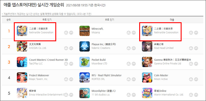 ... 일반적으로 구글 플레이스토어는 애플보다 발표가 느린 편이라 아직 집계되지 않고 있지만, 집계가 시작되면 상위권에 랭크될 것으로 예상된다. 대만의 구글(AOS)과 애플(IOS)의 이용자 비율은 약 6. 5:3