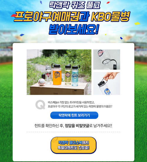 ... 추첨을 통해 총 30명에게 프로야구 예매권, 비스프리 KBO 물병 등이 선물로 주어진다. 성무경 NHN티켓링크 광고마케팅팀 팀장은 “락앤락과 함께 준비한 프로야구 예매권과 구단 별 물병으로 한여름 시원하게 경기를 즐기시기 바란다”며, “NHN티켓링크는 온·오프라인 티켓 예매 시스
