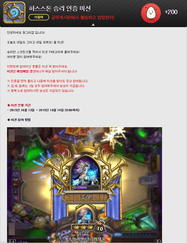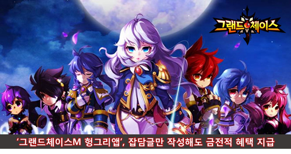 ... 이번 이벤트는 '잡담만 하면 10명에게 200 밥알!'로 '그랜드체이스M 헝그리앱' 커뮤니티에 이벤트 기간 동안 게시글과 댓글을 작성하면 추첨을 통해 헝그리앱 내에서 현금처럼 사용할 수 있는 밥알 포인트를 지급한다. 본 이벤트는 10월 20일까지 진행하며 자세한 내용은 '