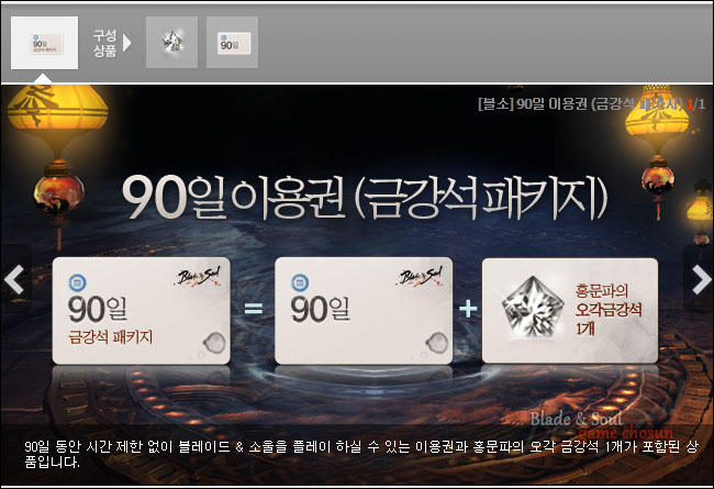 ... 신규 90일 이용권, 금강석 패키지! 공격력 +19 금강석을 준다! 새로운 90일 이용권이 28일 새벽 1시경 갑작스럽게 공개 됐다! 이번에 등장한 신규 이용권은 '금강석 패키지'이며, 금강석 패키지는 90일 이용권과 함께 홍문파의 오각 금강석을 주도록 구성돼 일반
