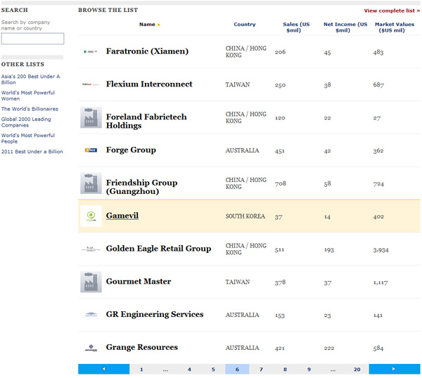 ... 선정 기준은 매출과 이익 성장, 3년 이상의 수익, 영업 활동, 기업 준법성 등이다. 이번 발표에는 게임빌을 포함해 15개의 한국 기업이 이름을 올렸다. 선정 기업의 사업 분야는 IT, 엔터테인먼트, 제약, 교육 등 15개로 게임 분야에서는 게임빌이 유일하다