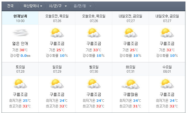 ... 하지만 이번 GSL 시즌3 결승전에서는 날씨 걱정은 할 필요가 없을 전망이다. 기상청에 따르면 GSL 결승이 열리는 27일 부산 날씨는 최고 기온 32도로 강수 확률은 10%에 불과하다. 구름만 조금 끼는 쾌청한 날씨인 것