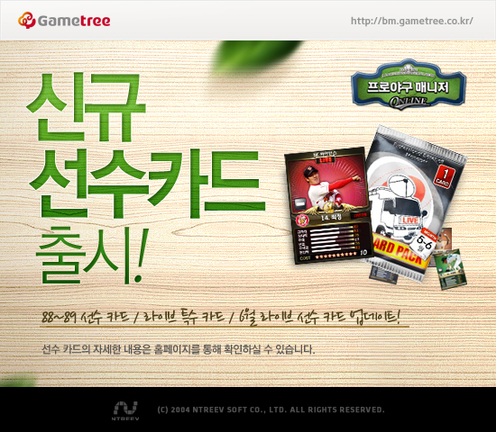 ... 엔트리브는 2012년 프로야구의 현장감과 재미를 반영하기 위해 월별 성적이 반영된 '라이브 선수카드'를 선보인 바 있다. 라이브 선수카드의 재미를 강화하기 위해 특수 카드인 '라이브 원(ONE)'과 '라이브 레어(Rare)'를 추가한다. 라이브 원은 매달 각 팀에서 뛰어